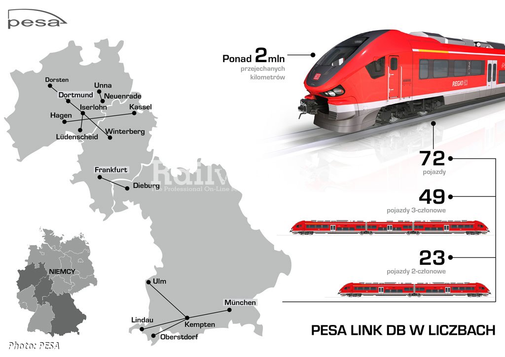 The framework agreement for up to 420 LINKs worth 1.2 billion EUR was signed on 19 September 2012 at InnoTrans. Two years later, PESA presented in Berlin a prototype, which finally received an EBA approval on 30 May 2018 and subsequently entered passenger service. In total, Pesa delivered to DB 72 LINKs, of them 23 two-car Class 632s and 49 three-car Class 633s. The 140 km/h trains have traveled over 2 million km so far.