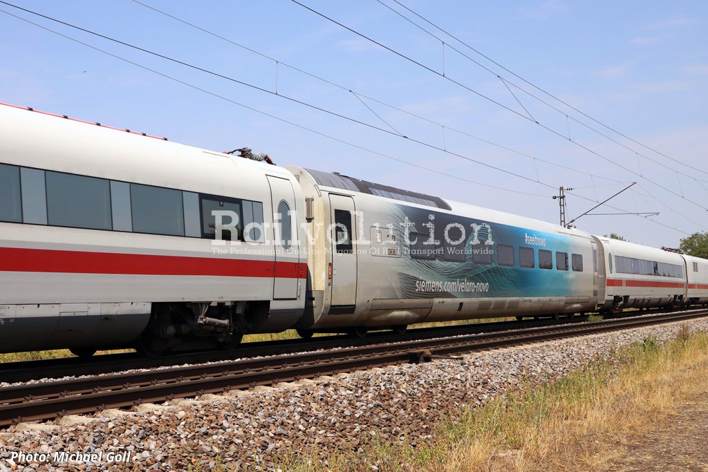 In April 2018 testing began of the Velaro Novo prototype car, which has been incorporated in DB Systemtechnik’s ICE-S test train, running throughout Germany. It is equipped with many new features, including the bodyshell, bogies, doors and windows. The bogies - one powered and one trailer bogie - were manufactured by Siemens Graz. However the motorised bogie is not yet being used for traction purposes, and is tested as if it was a non-powered bogie.