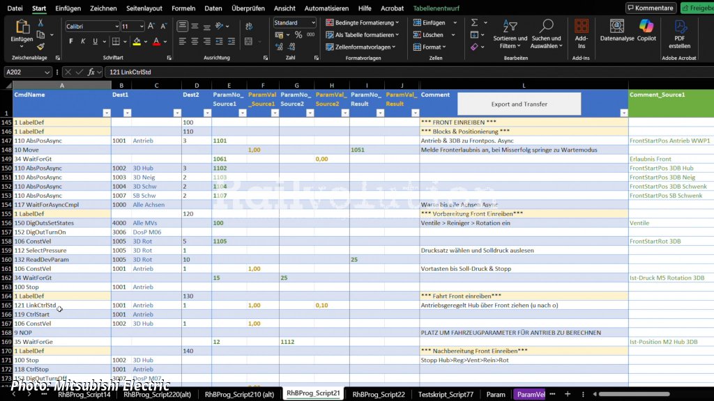As a pure scripting language, ATINA's low-code programming eliminates the need for hard-coded, line-by-line programming. Washing programs can be easily parameterized using Excel spreadsheets, even without in-depth programming knowledge. This saves time, reduces sources of error, and facilitates subsequent revisions. With only 200 lines of text instead of 4,000, the programs are clearer and easier for service personnel to understand. The programs created in Excel can be transferred directly to the Mitsubishi control system via a simple CSV export.