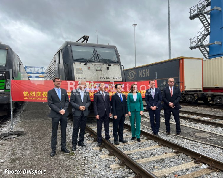 This photo shows the train following arrival in Duisport. From left to right are Johannes Grünhage (Head of China Affairs Department, Duisburg City), Markus Teuber (Duisburg City China Representative), Zhang, Wen (CRCT Europe General Manager), Du, Chunguo (Düsseldorf Chinese Consul General), Tabea Klang (DB Cargo Eurasia's Chief Sales Officer), Dr. Carsten Hinne (Duisburger Hafen Executive Board Member) and Michael Kleifges (DIT Duisburg Intermodal Terminal General Manager).