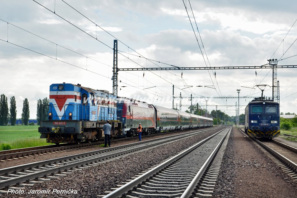 The large test track circuit (Železniční zkušební okruh, ŽZO) near the villages of Cerhenice and Velim, around 50 km east of Praha, was inaugurated in June 1963. On 20 May 2013 VUZ (Výzkumný Ústav Železniční - Rail Research Institute), which runs the testing complex, invited more than 200 guests to celebrate its 50th anniversary, which was marked by the presence of some interesting items of rolling stock. These included ČD’s Pendolino 680.003 and ÖBB’s railjet rake 80-90.716, the latter powered by 1216 229 (both locomotive and stock having participated in the presentation tour from Wien to Praha and Ostrava in April 2013). This train travelled from Austria via Havlíčkův Brod, and the accompanying photos show it first arriving at Kolín, then at nearby Velim station, and finally on the large test circuit. Both the 680 and the railjet were used to take guests on trips round the large test circuit. There were several other static „exhibits“ to be seen, including Class 146.5 and 187 TRAXXes. The final photo in the sequence shows the railjet on its return run to Austria, passing through Kolín.